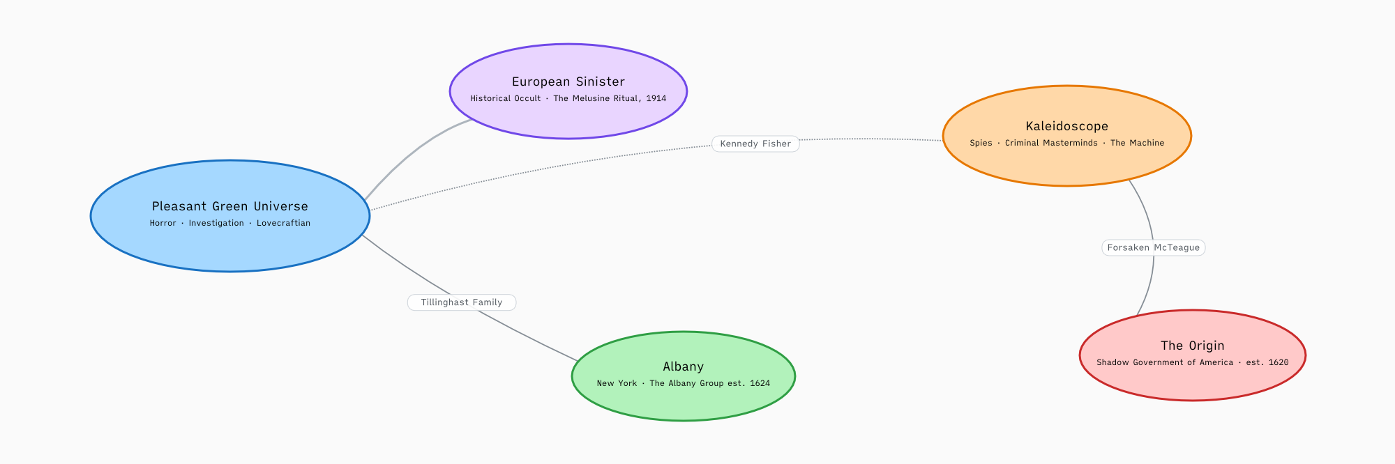 The universes that now sit under the Pure Hokum umbrella arrived organically, over years, and started connecting to each other before I fully understood what was happening. Characters from one world turned up in another. Institutions developed branch offices across continents and centuries. The Tillinghast family, who have been causing trouble in Pleasant Green for years, apparently have cousins in New York; Kennedy Fisher nearly met Aldrich Kemp once in Amsterdam; The Origin's Forsaken McTeague has helped out the Themis Group on several occasions...